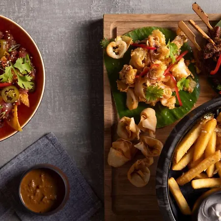 L'hôtel sert un petit-déjeuner anglais complet. Le restaurant Open Sesame sur place sert une grande variété de plats moyens orientaux. Le bar à jus est complété par télé et une chicha.
